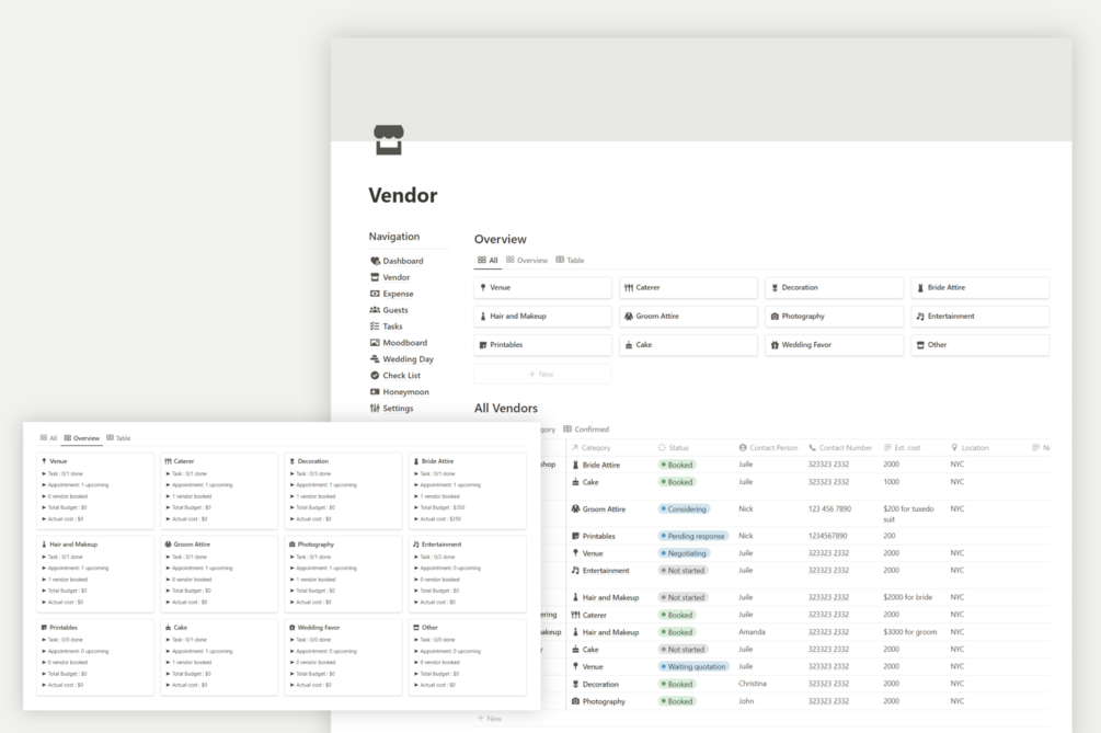 Looking for a wedding planner to keep all your special day details in order? Look no further! This notion wedding planner is the perfect solution to help you stay organized while planning the perfect wedding.